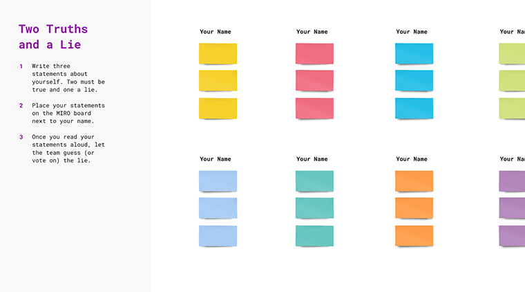 Two Truths and a Lie is best used as a Warmup • MIRO Template >
